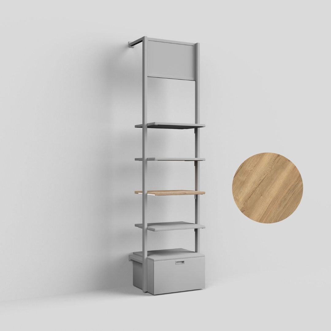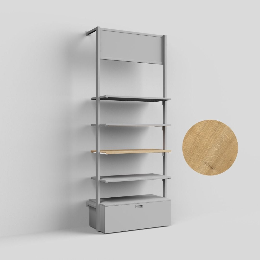 Die Fachbodenkonsolen sind pulverbeschichtet in weiß Struktur und werden seitlich mit jeweils zwei Schrauben am Boden befestigt. Anschließend kann der komplette Holzfachboden werkzeuglos und unkompliziert im System eingehängt werden.